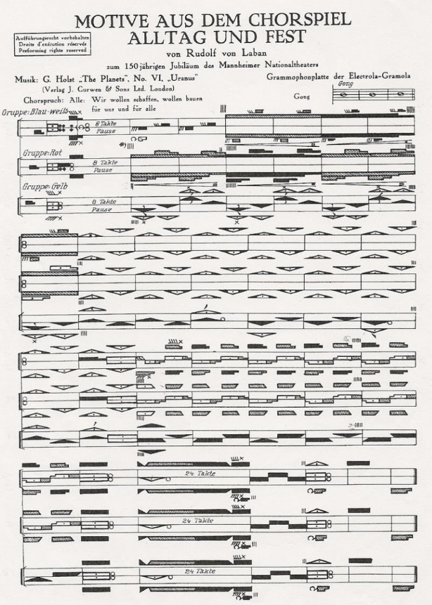 Les pièces de Laban ce sont souvent des groupes définis par une couleur, qui s'engagent et se désengagent. C'est une alternance d'images statiques que la chorégraphie transforme soudain en une autre image statique, le tout en une organisation de l'espace. Il y un jeux avec les oppositions mais le final se termine dans l'harmonie.